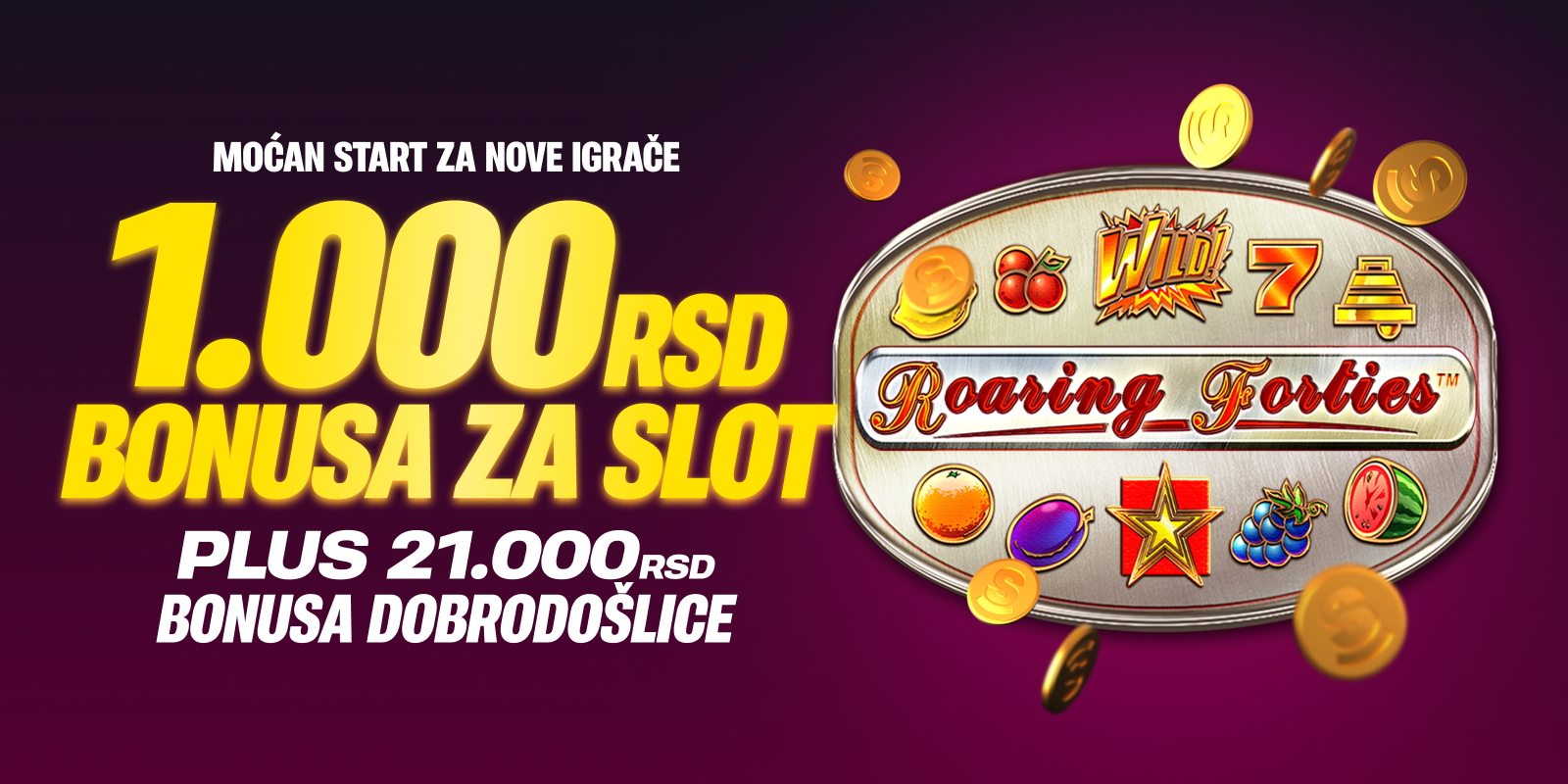 - Uzmeš 1.000 RSD slot bonusa za Roaring Forties, 21.000 RSD bonusa dobrodošlice i 500 RSD za preuzimanje aplikacije